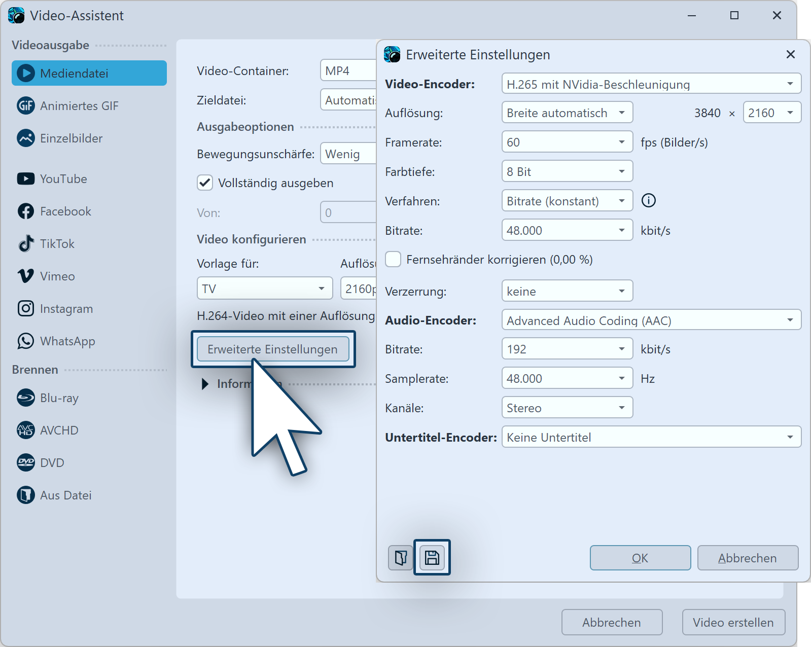![]() Export-Vorlage speichern STAGES In AquaSoft Stages können Sie Ihre Videos per Kommandozeilen-Aufruf generieren lassen. Erstellt werden diese mit Vorgaben, die Sie vorher als Export-Vorlage gespeichert haben. Vorlage speichern Speichern Sie diese Vorlage nun, indem Sie auf das Diskettensymbol klicken und einen Namen vergeben. ![]() Die Vorlage wird als vwp-Datei angelegt. Über Ordner öffnen können Sie sich den Speicherort Ihrer vwp-Datei anzeigen lassen. |