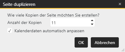 Dupliziert die ausgewählte Seite und fügt Sie nach der ausgewählten Seite ein. Im nächsten Schritt kann die Anzahl der Kopien eingegeben werden. |