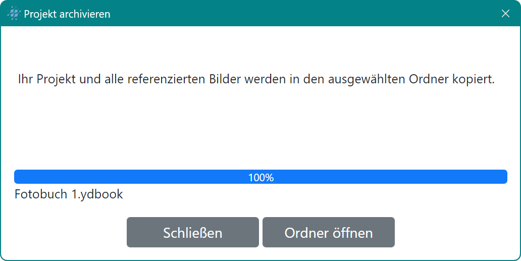 Für diesen Zweck gibt es unter Menü / Projekt archivieren eine Option, die die Projektdatei und alle verwendeten Dateien in einen Ordner kopiert. Über diese Archivierungsdatei können Sie Ihr Projekt auch auf einem anderen Rechner weiter bearbeiten, auf dem AquaSoft YouDesign Photo Book installiert ist.