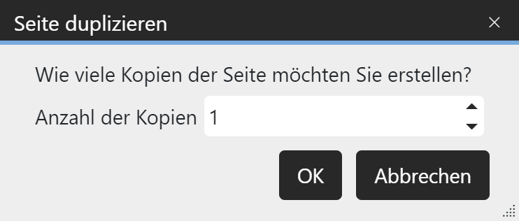 ![]() Anzahl neuer Seiten beim Duplizieren festlegen Um ein selbst gestaltetes Seitendesign auf weitere Kalenderseiten zu übernehmen, markieren Sie die zu vervielfältigende Seite im Seiteneditor und klicken auf das Duplizieren-Symbol. Geben Sie die Anzahl der Kopien ein. |