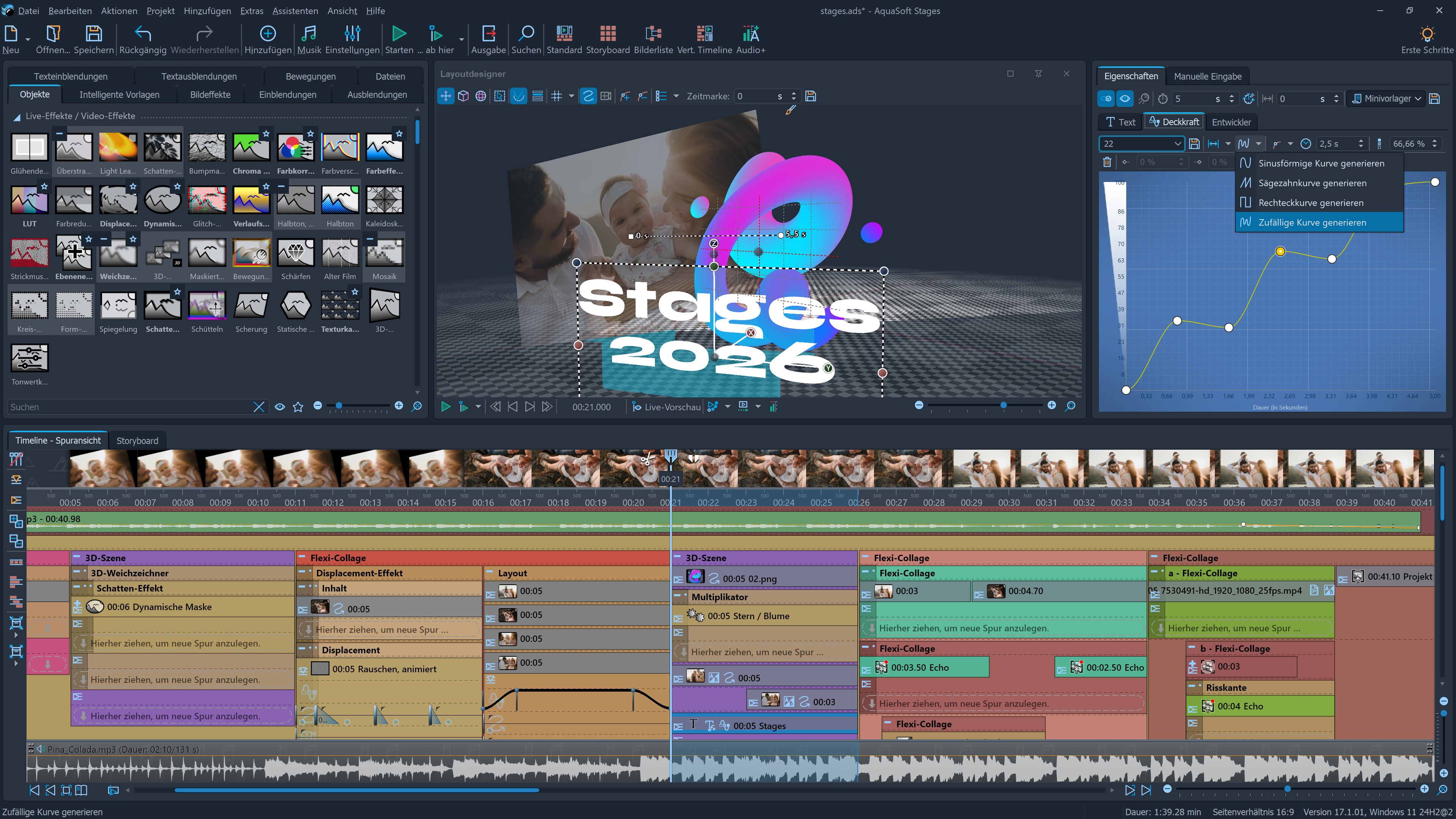 AquaSoft Stages steigert Ihre Effizienz beim Erstellen und Schnitt Ihres Video-Contents. Intuitive Einarbeitung und umfassende Funktionen machen Sie mit Stages als Ihrem neuen All-In-One-Werkzeug so produktiv. Kombinieren und animieren Sie verschiedenste Materialien, wie Videos, Fotos, Texte und Musik mit einem leistungsstarken Effektbaukasten und vielen Bearbeitungsmöglichkeiten. Stages bietet Funktionen, die große Projekte oder wiederkehrende Prozesse effizient machen, sowie leistungsfähige Exportmöglichkeiten mit einem schnellen hardwarebeschleunigten Renderer. Stages arbeitet als eigenständige Anwendung oder integriert sich über standardisierte Plug-in-Schnittstellen in andere Anwendungen.