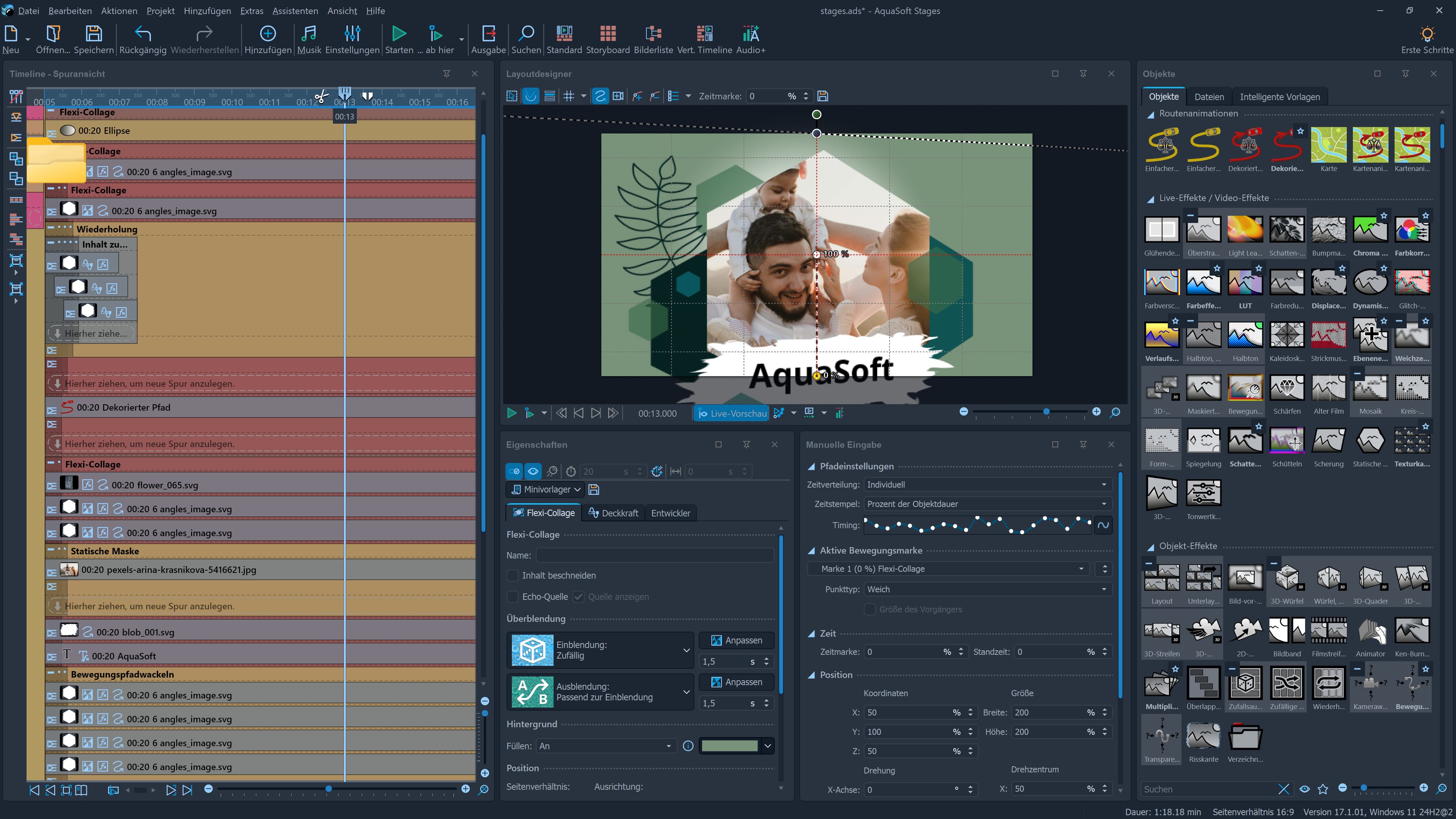 Sie erstellen eine interessante Logo-Animation oder einen Call-To-Action-Button? Jedes Element lässt sich einzeln animieren, aber eine wahre Stärke ist die Animation in Gruppen. Dafür gibt es die Flexi-Collage in AquaSoft Stages, mit der Sie hierarchische Animationen erstellen können oder einfach nur eine Collage von mehreren Motiven gemeinsam einblenden. Eine Flexi-Collage bietet wie ein Kapital beliebig viele Spuren und lässt sich verschachteln und benennen. So gewinnen Sie maximale Übersicht, da alle beteiligten Elemente einer eingeklapptern Collage nun wie ein Element in der Timeline wirken und gemeinsam verschoben und platziert werden können.
