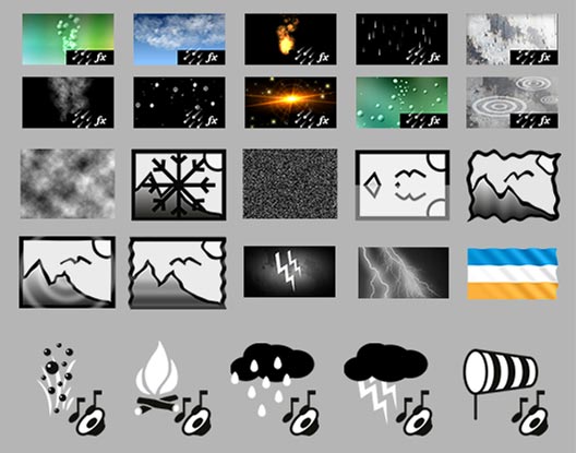 Luftblasen, Wolkenhimmel, Flammen, Regen, Regentropfen, Rauch, Schnee, Sternenhintergrund, Unter Wasser, Wellenringe, Gewitter - 8 Live-Effekte: