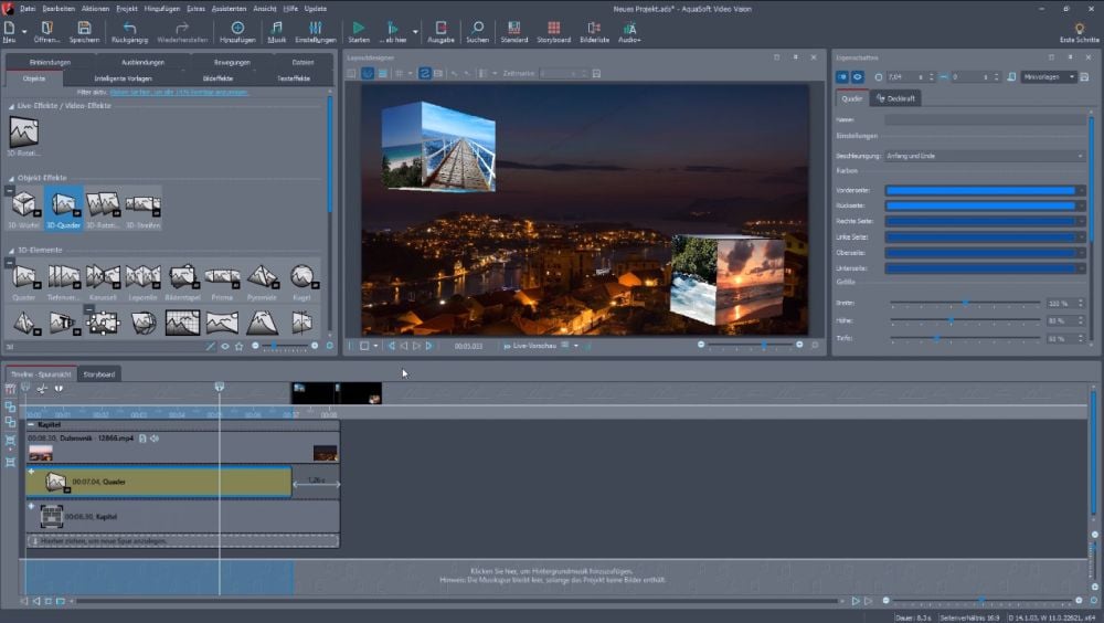 - 3D-Quader - Seiten mit Videos füllen, Position/Größe + Rotation + Zeitverhalten anpassen