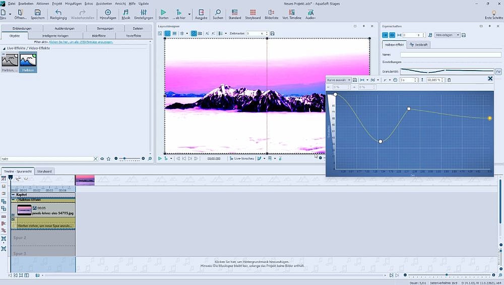 In diesem Kapitel zeigen wir die praktische Anwendung und Bearbeitung verschiedener Media-Bausteine (Clips, Animationen, Buttons, Inhalte, Beschriftungen, Logos sowie Texte) und geben Tipps zu Einsatzgebieten. Weiterhin geht es im Detail um die Halbton-Effekte und den verfügbaren Kritzelkunst-Effekten in statischer Form sowie animiert mit Keyframes (Kurven). So bekommen Sie weitere Dynamik in die Effekte und letztendlich in Ihr Filmprojekt. Zum Abschluss in diesem Kapitel geht es um den Displacement-Effekt, dem Vermischen und Überlagern von Fotos und Videos.