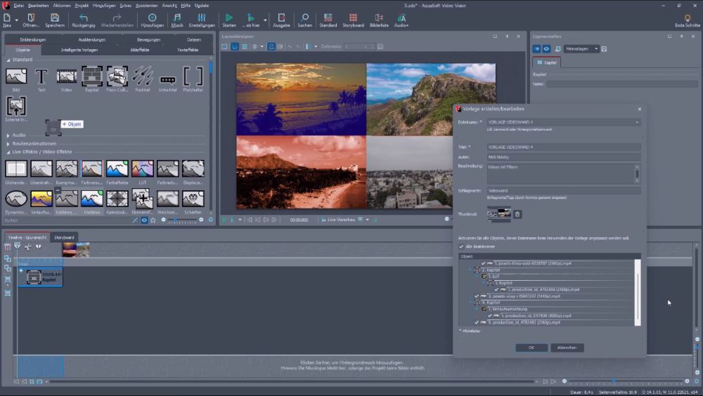 Das große PLUS an diesem Lernkurs ist, dass wir Ihnen diverse von uns konstruierte Foto- und Videowände als fertiges Projekt/Vorlage im Zubehör-Ordner mitliefern, die Sie einfach mit Ihren Fotos und Videos füllen müssen. Das gelingt sehr einfach und die eingestellten Effekte bleiben so auch erhalten. Wir erklären selbstverständlich, was beim Laden der Projekte/Vorlagen in Video Vision zu beachten ist.