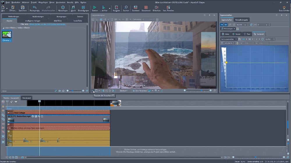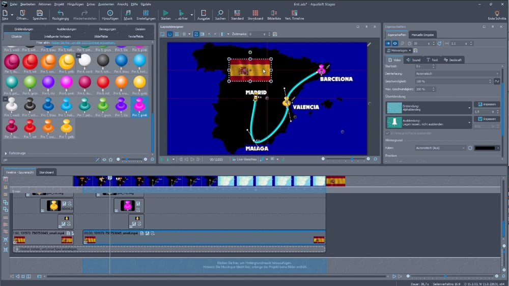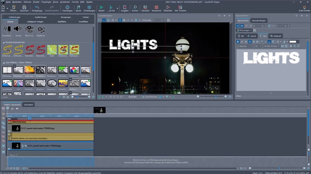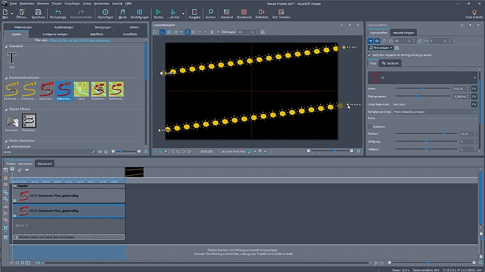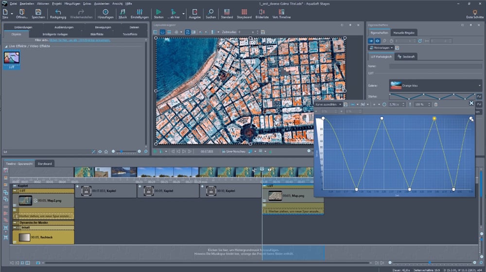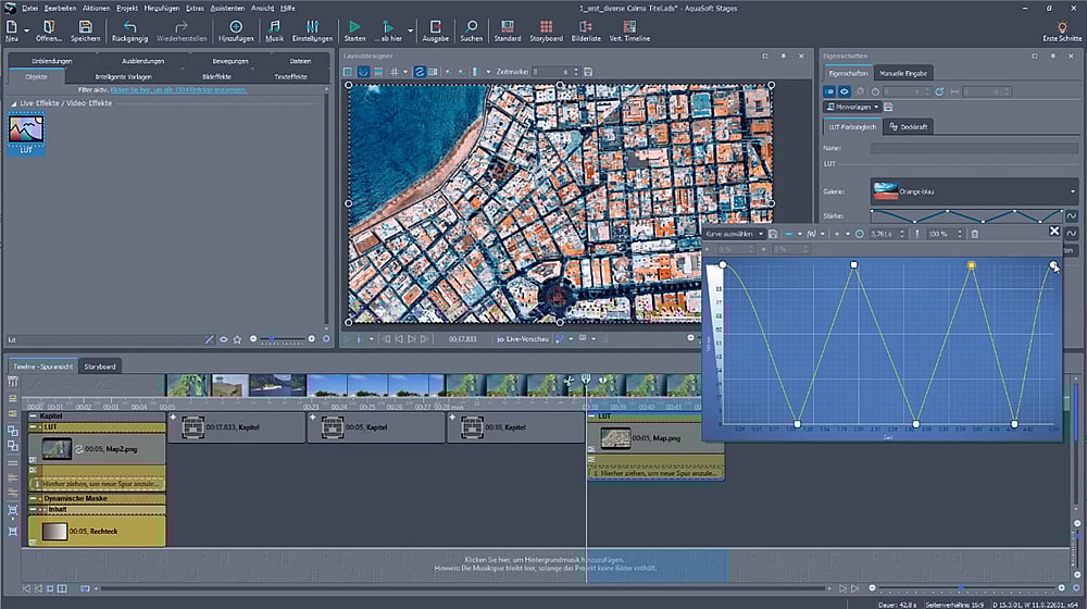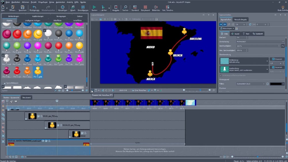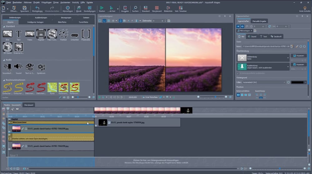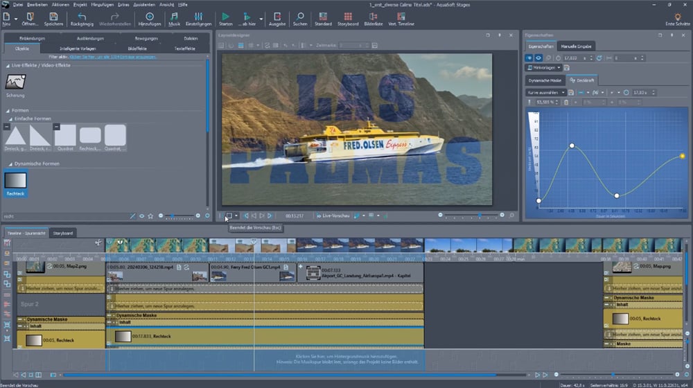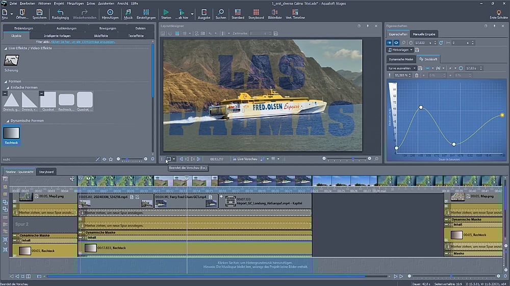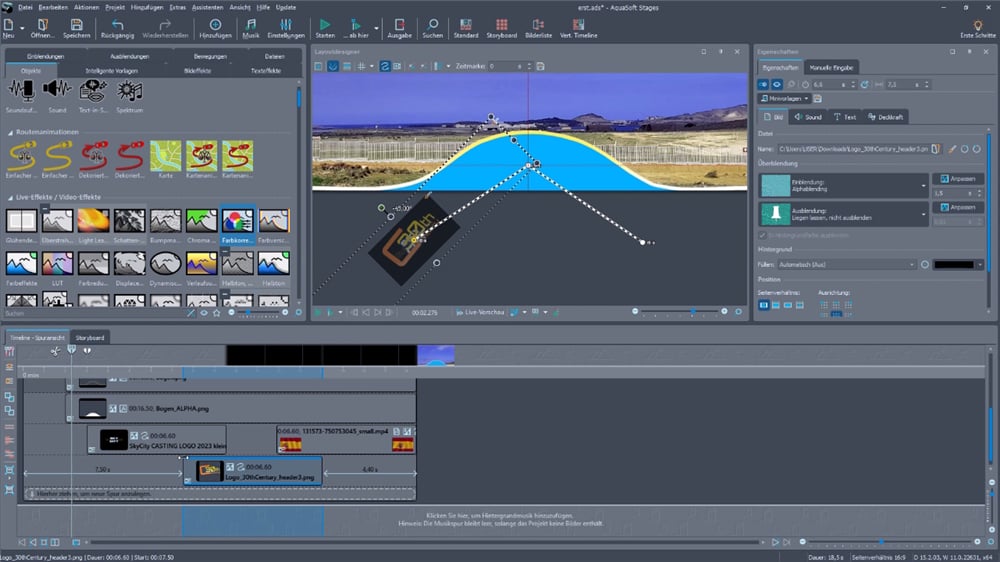In den folgenden Workshops präsentieren wir Ihnen neue kreative Effektgestaltungs-Ideen, u.a. Routenanimationen als dekorierten Pfad mit Symbolen, Titeln, Hintergründen und allen Detaileinstellungen. Weiterhin stellen wir Ihnen einen kreativen Event-Auswahl-Effekt sowie eine Videowand-Animation, die als Bilder bzw. Video-Wechselanimation abgebildet wird, das alles jeweils mit vorgefertigten Projekten. Weitere Effekte, Routenanimationen auf einer aufbereiteten Umrisskarte mit zahlreichem Zubehör (Objekten, Flaggen und Pins) folgen bis hin zu einem selbsterstellten Wisch-Effekt und der Erstellung von Bodennebel in einem passenden Video. Eine eigene Bogenblenden-Animation z.B. für ein Intro runden die kreativen Gestaltungsmöglichkeiten ab. Auch KI darf in diesem Lernkurs nicht fehlen, wir lassen einen Hund sprechen und erstellen Untertitel aus gesprochenem Text u.v.m.
