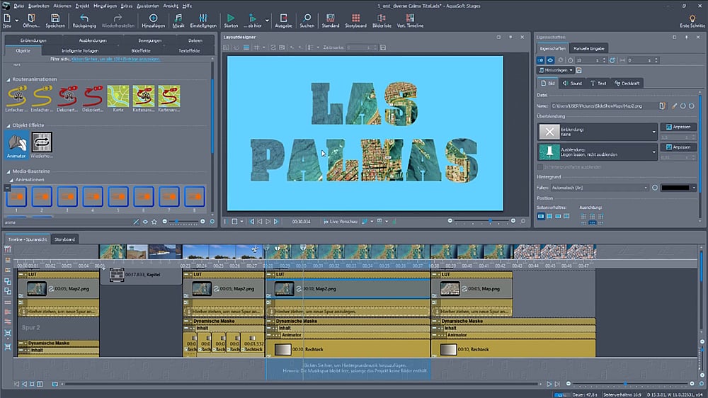 In den folgenden Lektionen stellen wir Ihnen neue Kreativ-Ideen vor, u.a. Routenanimationen als dekorierten Pfad mit Symbolen, Titeln, Hintergründen und allen Detaileinstellungen. Dann stehen ein selbsterstellter Event-Auswahl-Effekt sowie eine Videowand-Animation jeweils mit vorgefertigten Projekten im Mittelpunkt. Weitere Effekte, Routenanimationen auf Umrisskarten mit zahlreichem Zubehör folgen bis hin zu einen selbsterstellten Wisch-Effekt und der Erstellung von Bodennebel. Eine Bogenblenden-Animation für ein Intro runden die kreativen Gestaltungsmöglichkeiten ab. Auch KI darf nicht fehlen, wir lassen einen Hund sprechen und erstellen Untertitel aus Sprache u.v.m.