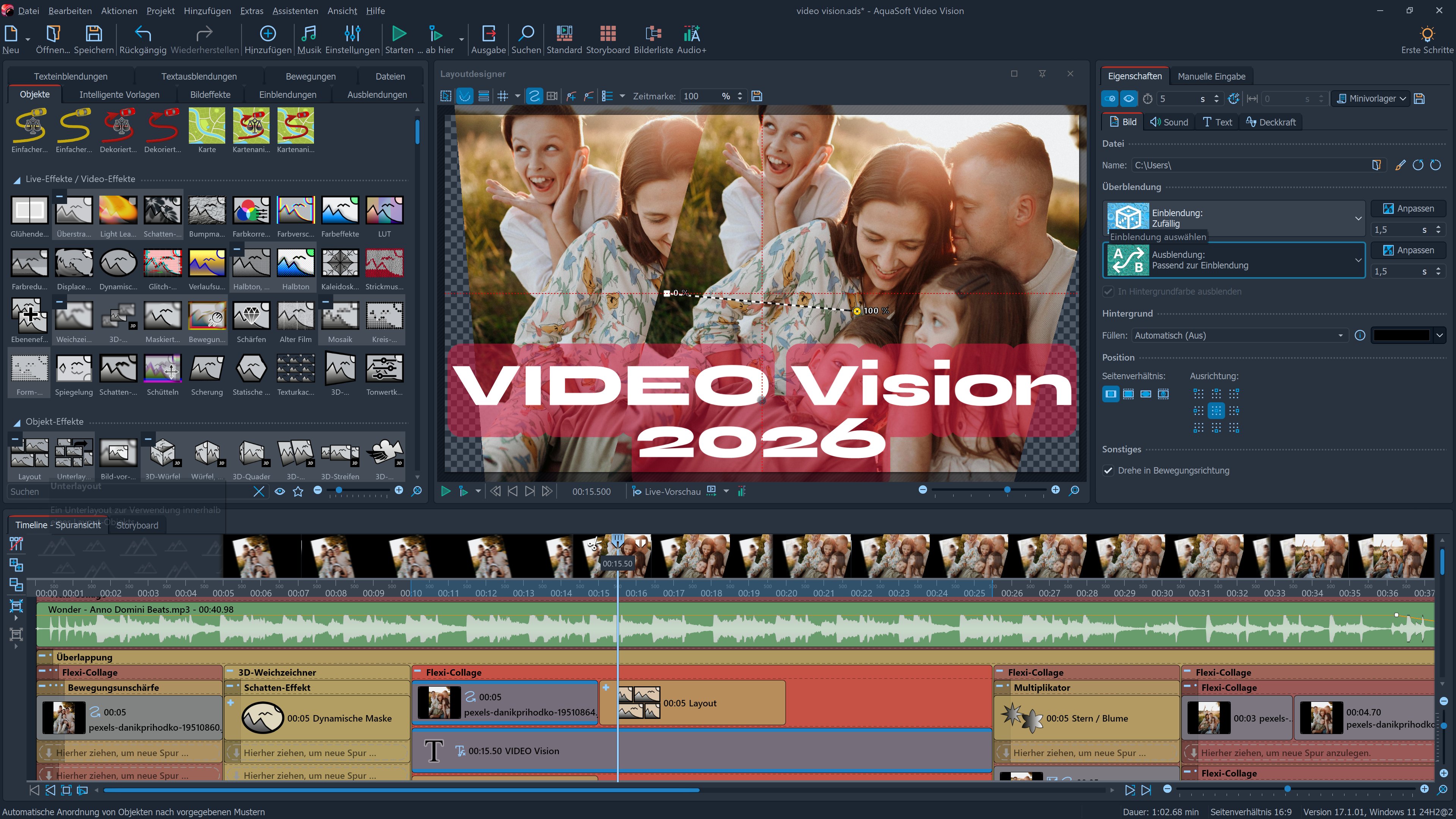 - Objekt-Effekte, die Ihre Bilder automatisch animieren oder arrangieren, z.B. mit weichem "Ken Burns"-Effekt ineinander überblenden oder in einem Filmstreifen scrollen
