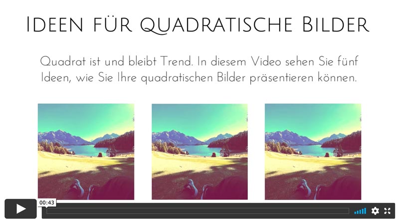 Das Beispielprojekt zeigt 5 Varianten, wie sich quadratische Fotos präsentieren lassen. Zeigen Sie mehrere Bilder nebeneinder, mit dem Animator oder dem Layouteffekt oder verwenden Sie Bild-Text-Kombinationen.