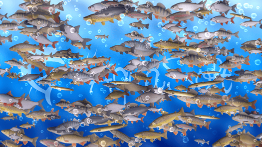 Vor einem blauen Hintergrund schwimmen viele verschiedene Fische in einer Auf- und Abbewegung von rechts nach links. Dabei steigen Wasserblasen auf, die den Eindruck von bewegtem Wasser verstärken. Am Ende ist eine Liste aller Fischarten zu sehen.