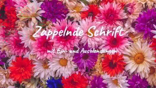 Eine Schrift wird vor einem Bild eingeblendet. Dabei zappeln die Buchstaben und die Textzeile bewegt sich leicht vor dem Bild. Eine weitere Zeile wird eingeblendet und die erste Zeile blendet sich mit einer kurzen Bewegung nach oben aus. Die Bewegungs des Textes erfolgt mit dem Effekt "Bewegungspfadwackeln", die Zappelschrift entsteht durch den Effekt "Handgezeichnete Kanten" aus dem Erweiterungspaket "Kritzelkunst".